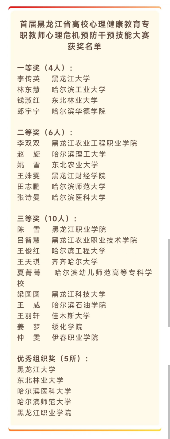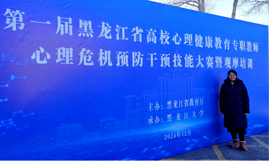 近日,由黑龍江省教育廳主辦,黑龍江大學承辦的首屆黑龍江省高校心理健康教育專職教師心理危機預防干預技能大賽成功舉辦,來自全省本科和??圃盒5?/span>60余名心理健康教育專職教師參賽,省教育廳思想政治教育處負責同志、全省78所高校心理健康教育專職教師代表共同觀摩大賽。公共教學部心理健康教研室(心理健康教育中心)教師仲雯憑借出色的表現(xiàn),榮獲了本次大賽三等獎。