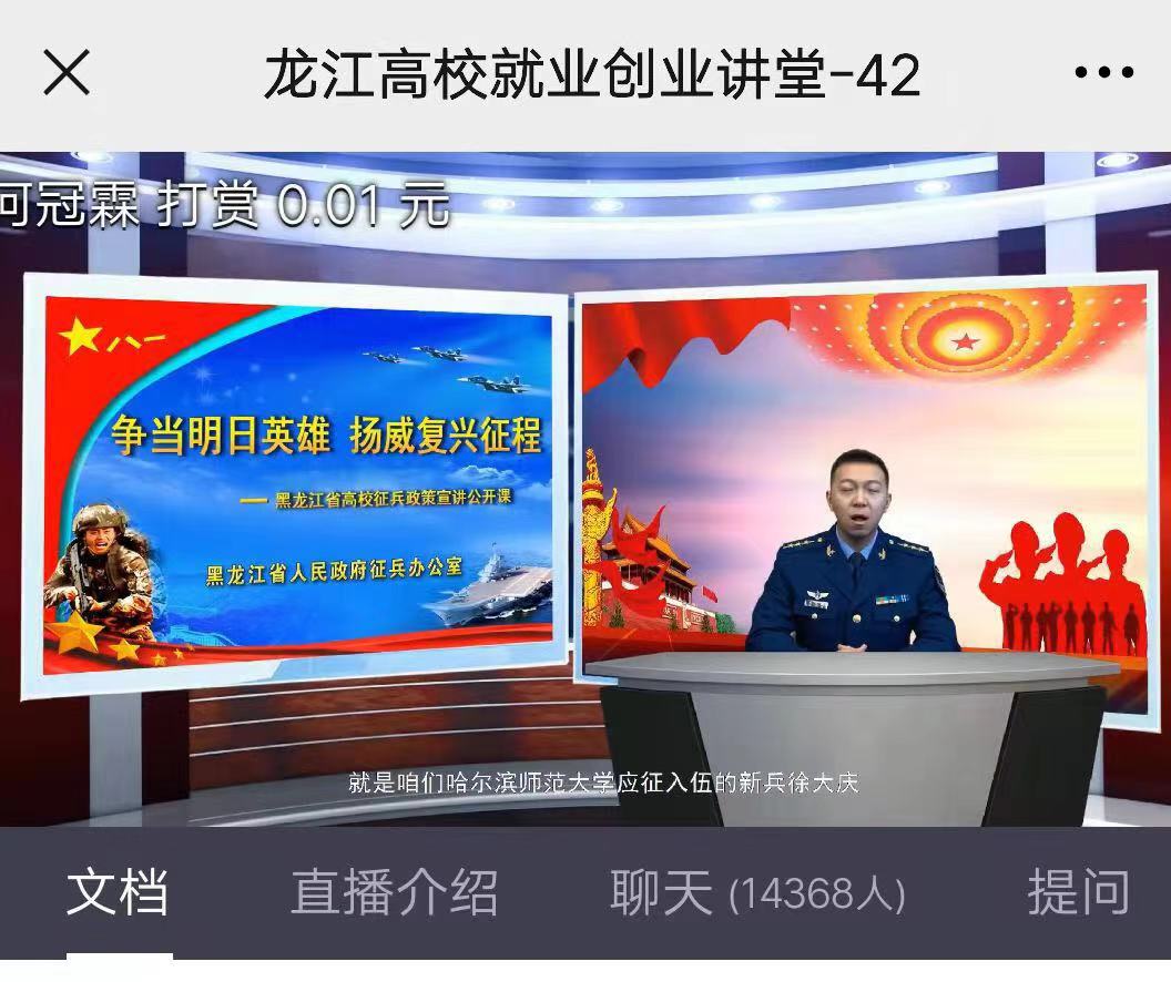 我校征兵工作站站長趙小澤同志作了大學(xué)生征兵工作情況介紹和經(jīng)驗分享,現(xiàn)場解讀了2022年征兵優(yōu)惠政策,并現(xiàn)地開設(shè)征兵宣傳點進行一對一、面對面精準(zhǔn)宣傳發(fā)動?;顒舆€邀請兩名優(yōu)秀大學(xué)生退役士兵,通過現(xiàn)場宣講、視頻連線、交流互動等方式,分享自身軍旅成長經(jīng)歷,展示大學(xué)生士兵風(fēng)采。