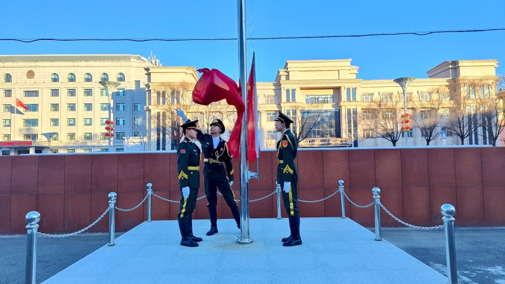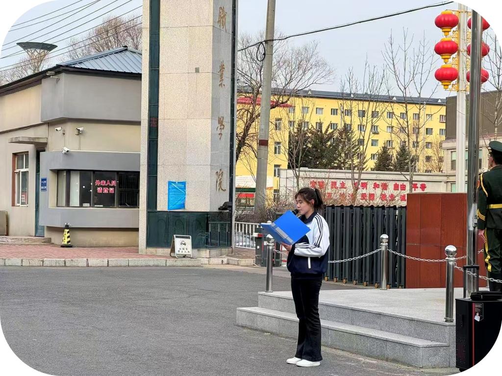 7時整,國旗護衛(wèi)隊隊員們邁著鏗鏘有力的步伐,護衛(wèi)著五星紅旗。他們身姿挺拔,眼神堅定,展現出了青年一代的昂揚風貌。當雄壯的國歌奏響,鮮艷的五星紅旗迎著朝陽冉冉升起。全體師生行注目禮,高唱國歌,心中滿是對祖國的熱愛與崇敬之情。教師代表劉萬春和學生代表赫美玉分別在國旗下激情洋溢地發(fā)言。