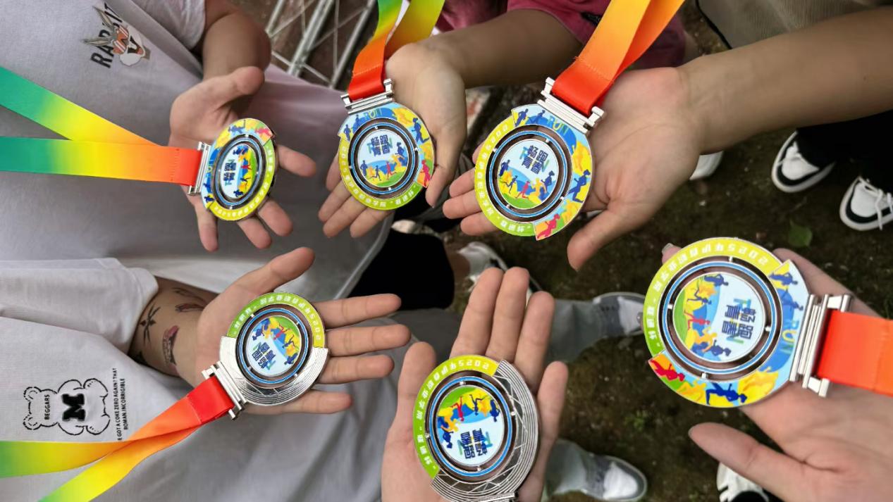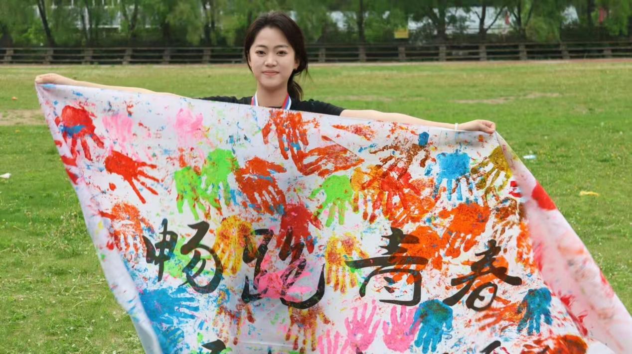 在終點(diǎn)處別具一格的“掌上青春”環(huán)節(jié)中,每位完賽者在白色旗幟上留下五彩手印,共同繪制出充滿拼搏與團(tuán)結(jié)的青春畫卷。