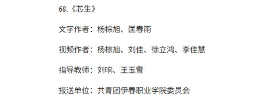近日,中國(guó)教育報(bào)高校愛(ài)國(guó)主義教育案(課)例及大學(xué)生愛(ài)國(guó)主義主題微視頻征集推選作品名單公布。我校劉響、王玉雪兩位老師指導(dǎo),楊棕旭、匡春雨、劉佳、徐立鴻、李佳慧五位同學(xué)制作的微視頻《芯生》成功入選。