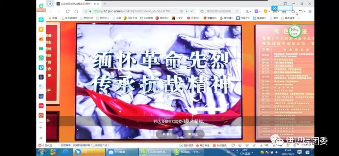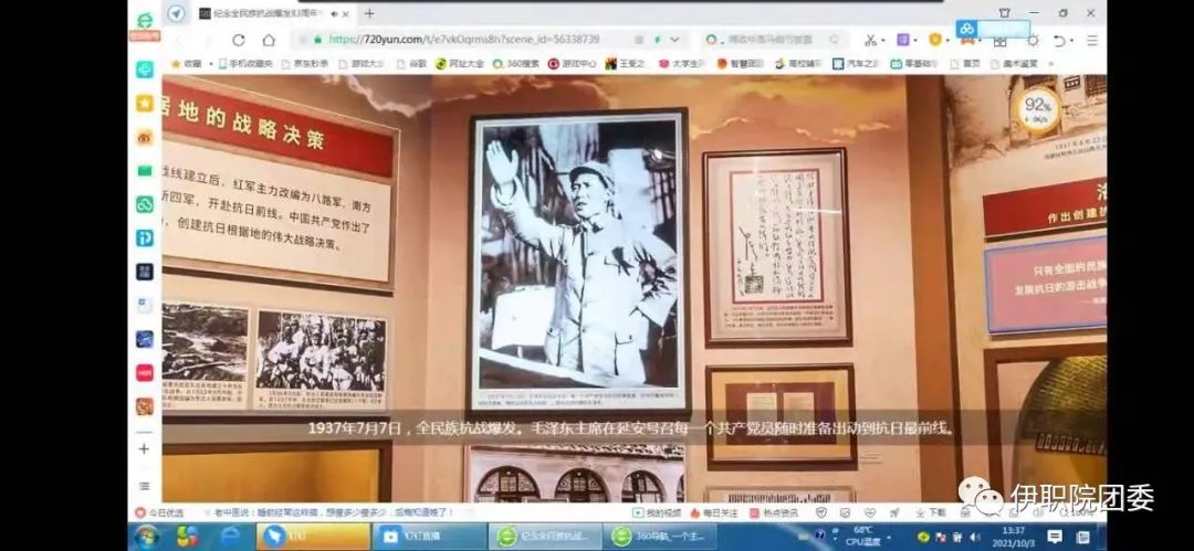 下午1:30分,為紀(jì)念抗日戰(zhàn)爭(zhēng)勝利76周年,緬懷革命先烈,校團(tuán)委組織伊春職業(yè)學(xué)院全體學(xué)生會(huì)干部通過(guò)線上VR視頻形式參觀了中國(guó)人民抗日戰(zhàn)爭(zhēng)紀(jì)念館。