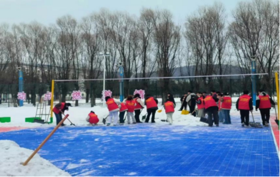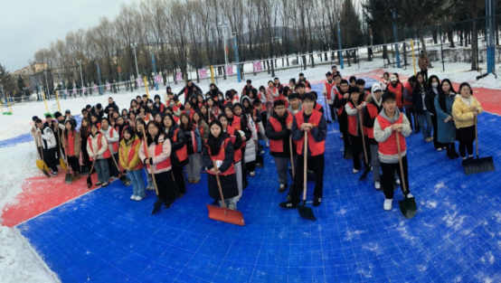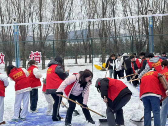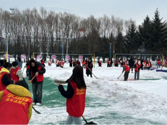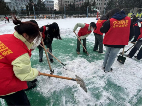 青年志愿者賣(mài)力的揮動(dòng)手中的鏟雪工具,他們用熱情融化冰雪,用行動(dòng)溫暖校園,“紅馬甲”穿梭在體育場(chǎng)中,形成了一道亮麗的風(fēng)景線。志愿者們積極的對(duì)體育場(chǎng)路面進(jìn)行劃片分組,各司其職、團(tuán)結(jié)協(xié)作。經(jīng)過(guò)一下午的辛勤勞動(dòng),體育場(chǎng)的積雪和冰層很快被清理干凈,為師生打造出安全寬敞的體育運(yùn)動(dòng)場(chǎng)所。