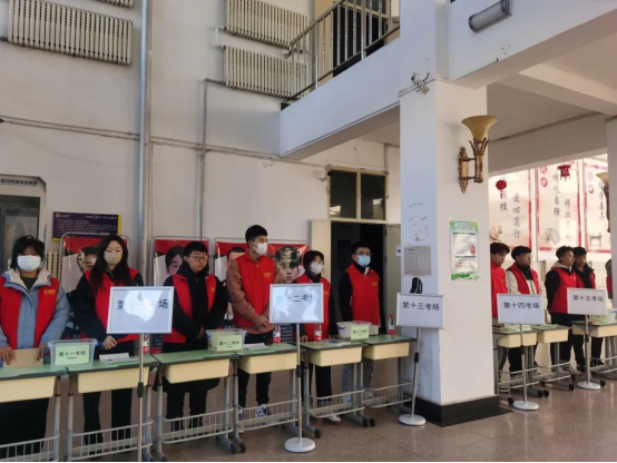 考試前期,志愿者們精神飽滿(mǎn),準(zhǔn)時(shí)著裝到崗。志愿者分成校園指引、考場(chǎng)引領(lǐng)兩個(gè)隊(duì)伍。隨著考生們的到來(lái),志愿者們也邁開(kāi)了忙碌的步伐。考生進(jìn)入學(xué)校后,隨處可見(jiàn)的志愿者在學(xué)校為考生引路,引導(dǎo)學(xué)生找到自己的考試地點(diǎn),各考場(chǎng)區(qū)志愿者根據(jù)考生準(zhǔn)考證上的考場(chǎng)編號(hào),將各位考生順利帶到指定教室候考。在志愿者的幫助下,考生們都迅速的找到了自己考試的對(duì)應(yīng)教室。