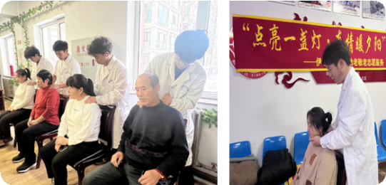 為深入學(xué)習(xí)貫徹習(xí)近平新時(shí)代中國(guó)特色社會(huì)主義思想和黨的二十大精神,積極響應(yīng)“健康中國(guó)”的戰(zhàn)略方針,更好地滿足老年人對(duì)高質(zhì)量醫(yī)療服務(wù)和人文關(guān)懷的需求,2024年12月4日下午14點(diǎn),伊春市委社會(huì)工作部、伊春職業(yè)學(xué)院和新欣社區(qū)聯(lián)合舉辦了“點(diǎn)亮一盞燈,真情暖夕陽(yáng)”助老敬老志愿活動(dòng)?!翱灯綐?lè)”中醫(yī)康復(fù)技能培訓(xùn)工作室?guī)熒谐跣模铝樯鐓^(qū)老人帶來(lái)“健康、平安、快樂(lè)”,由指導(dǎo)教師李洋、張程程帶領(lǐng)7名優(yōu)秀學(xué)員組成志愿服務(wù)隊(duì),為現(xiàn)場(chǎng)老年群眾診查常見(jiàn)疾病,進(jìn)行頸肩部推拿,并提供健康指導(dǎo)。