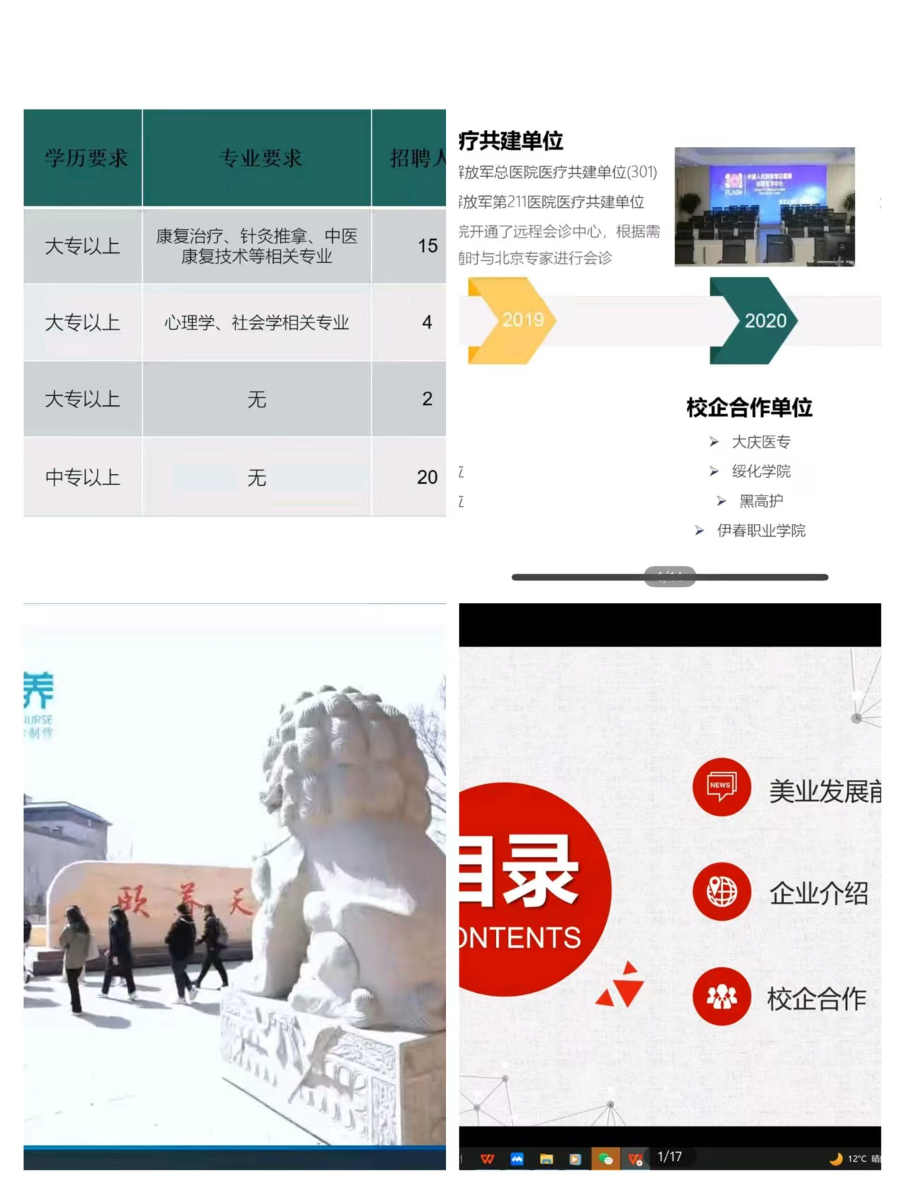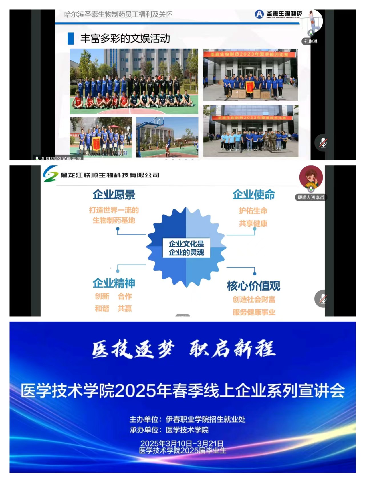 本次線上系列宣講會參與企業(yè)類型多元,涵蓋藥企、醫(yī)療檢驗、醫(yī)療器械研發(fā)、醫(yī)美、健康管理等多個領域,包括天津締美小華健康管理公司、哈爾濱兒童制藥廠、哈爾濱圣泰生物制藥有限公司、哈市一辰醫(yī)院、綏化萬康醫(yī)院、七臺河聯(lián)順生物科技等行業(yè)內頗具影響力的企業(yè)。企業(yè)代表利用騰訊會議開展線上宣講,從企業(yè)概況、發(fā)展歷程、企業(yè)文化、崗位需求、薪資待遇等方面進行了詳細介紹。