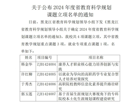 日前,醫(yī)學(xué)技術(shù)學(xué)院兩項(xiàng)課題獲得審批立項(xiàng)。其中,由許紅柳老師主持的“2024年度黑龍江省經(jīng)濟(jì)社會(huì)發(fā)展重點(diǎn)研究課題”《伊春地區(qū)健康養(yǎng)老產(chǎn)業(yè)復(fù)合型人才培養(yǎng)對(duì)策研究》獲批,同時(shí)還獲得了黑龍江省社科聯(lián)7000元的課題經(jīng)費(fèi)支持,為學(xué)校爭(zhēng)得了榮譽(yù);另一項(xiàng)由許紅柳老師主持的《以就業(yè)為導(dǎo)向的高職藥學(xué)專業(yè)復(fù)合型人才培養(yǎng)對(duì)策探究》獲“2024年度黑龍江省教育科學(xué)規(guī)劃重點(diǎn)課題”審批立項(xiàng)。