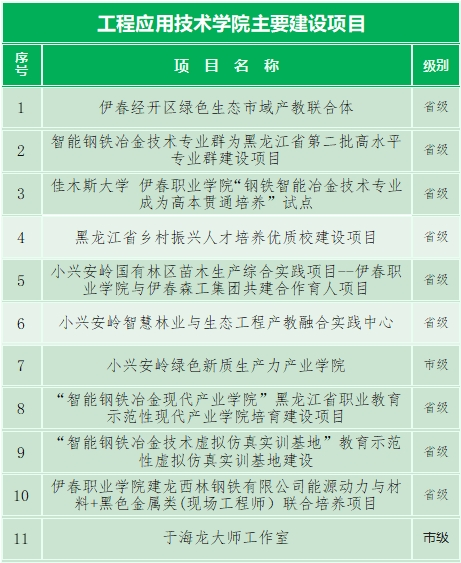 工程應(yīng)用技術(shù)學(xué)院積極參與國(guó)家、省重大項(xiàng)目建設(shè),近五年年工程應(yīng)用技術(shù)學(xué)院申請(qǐng)獲批或承接了省、市級(jí)項(xiàng)目13項(xiàng),包括黑龍江省高等學(xué)校資源型產(chǎn)業(yè)發(fā)展和裝備制造業(yè)緊缺人才培養(yǎng)培訓(xùn)基地項(xiàng)目、黑龍江省鄉(xiāng)村振興人才培養(yǎng)優(yōu)質(zhì)校、鋼鐵智能冶金技術(shù)專業(yè)成為高本貫通培養(yǎng)首批試點(diǎn)專業(yè)、智能鋼鐵冶金技術(shù)虛擬仿真實(shí)訓(xùn)基地獲批省級(jí)職業(yè)教育示范性虛擬仿真實(shí)訓(xùn)基地建設(shè)等十余個(gè)項(xiàng)目,獲得省和國(guó)家各項(xiàng)支持獎(jiǎng)補(bǔ)資金達(dá)2500余萬(wàn)元。