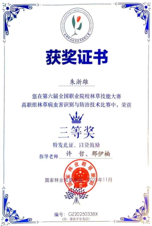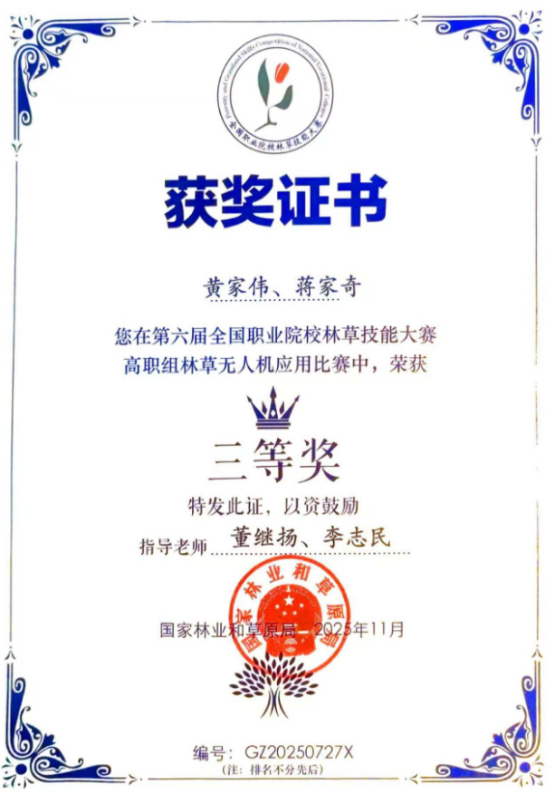 校領(lǐng)導(dǎo)對此次大賽高度重視,將其作為檢驗教學(xué)成果、錘煉學(xué)生技能、深化產(chǎn)教融合的重要契機。賽前,工程應(yīng)用技術(shù)學(xué)院精心部署備戰(zhàn)工作,從選手選拔、師資配備到訓(xùn)練方案制定均進行了系統(tǒng)規(guī)劃。此次我校共選派3支代表隊,分別征戰(zhàn)碳匯調(diào)查技術(shù)、林草病蟲害識別與防治、林草無人機應(yīng)用技術(shù)三個賽項。最終,2024級林業(yè)技術(shù)學(xué)生朱浙雄獲得林草病蟲害識別與防治技術(shù)三等獎,2024級林業(yè)技術(shù)學(xué)生黃家偉和蔣家奇獲得林草無人機應(yīng)用技術(shù)三等獎。