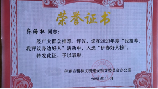 該生于2023年10月獲得黑龍江省委、省見義勇為獎勵基金會頒發(fā)的黑龍江省見義勇為英雄榮譽。