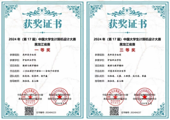 學(xué)院秉持“以賽促教、以賽促學(xué)”的理念,精心構(gòu)建“課證賽融通”的創(chuàng)新人才培養(yǎng)模式,全力推動(dòng)學(xué)生專業(yè)技能與綜合素質(zhì)的協(xié)同提升。學(xué)院積極組織學(xué)生參加“1+X”考試、WPS技能考試,實(shí)現(xiàn)“教學(xué)內(nèi)容與職業(yè)標(biāo)準(zhǔn)對(duì)接、實(shí)訓(xùn)過程與崗位需求同步”。近年來,我院在教育教學(xué)與實(shí)踐創(chuàng)新領(lǐng)域成果豐碩,充分彰顯了學(xué)院卓越的育人成效與師生過硬的專業(yè)素養(yǎng)。教師在“一帶一路”金磚國(guó)家職業(yè)技能大賽、黑龍江省教育教學(xué)能力大賽中榮獲三等獎(jiǎng)5 項(xiàng)。學(xué)生在黑龍江省教育廳主辦的學(xué)生技能大賽、2024年中國(guó)大學(xué)生計(jì)算機(jī)設(shè)計(jì)大賽黑龍江省賽、“挑戰(zhàn)杯”黑龍江省大學(xué)生創(chuàng)業(yè)計(jì)劃等競(jìng)賽中,榮獲一等獎(jiǎng)2項(xiàng)、二等獎(jiǎng)5項(xiàng)、三等獎(jiǎng)10項(xiàng)、金獎(jiǎng)2項(xiàng)、銅獎(jiǎng)3項(xiàng)、銀獎(jiǎng)2項(xiàng)的好成績(jī)。