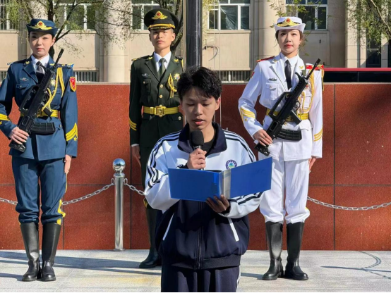 伴隨著雄壯的國歌,五星紅旗在師生們的目光中緩緩升起。隨后,計算機應(yīng)用技術(shù)學院孫澤寬同學作為學生代表上臺發(fā)言,他說,青年興則國家興,中國發(fā)展要靠廣大青年挺膺擔當。我們作為有責任心、有擔當?shù)那嗌倌?,要時刻銘記歷史賦予我們的使命,傳承黨的精神,愛國愛民,無私奉獻,不屈不撓。