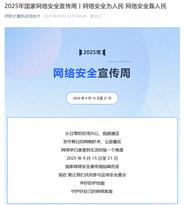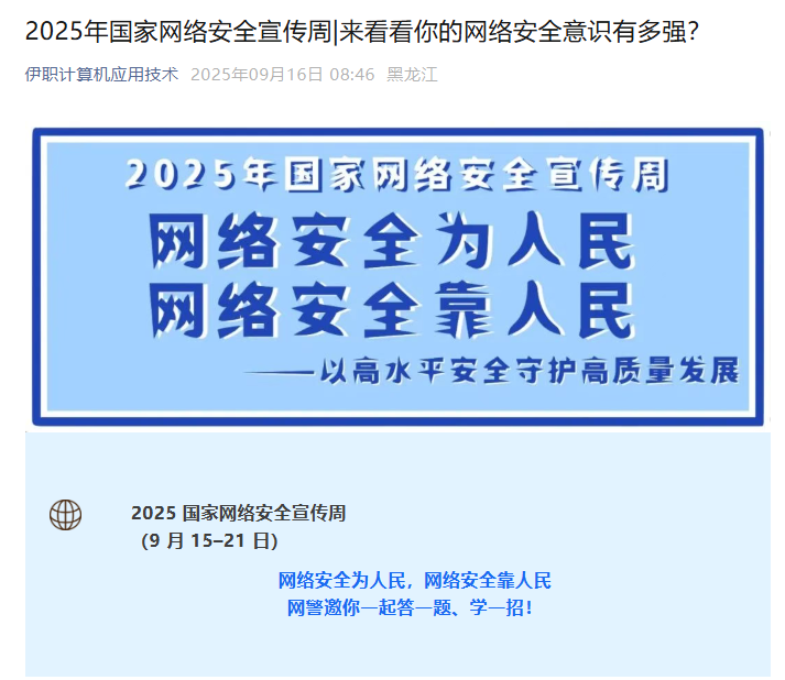 我院還依托“伊職計(jì)算機(jī)應(yīng)用技術(shù)”公眾號(hào)拓寬宣傳渠道,以互動(dòng)形式吸引師生參與,擴(kuò)大活動(dòng)影響力,方便師生獲取網(wǎng)絡(luò)安全知識(shí)。