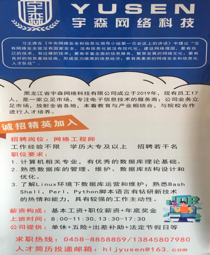 黑龍江省宇森網(wǎng)絡(luò)科技有限公司于2019年03月28日經(jīng)伊春市市場(chǎng)監(jiān)督管理局伊春分局批準(zhǔn)成立。為當(dāng)?shù)氐膶W(xué)生提供實(shí)習(xí)便利,公司兩位宣講人員給同學(xué)們介紹了到公司實(shí)習(xí)或者就業(yè)的相關(guān)要求和待遇問(wèn)題,誠(chéng)摯邀請(qǐng)同學(xué)們加盟到他們的工作團(tuán)隊(duì)中。