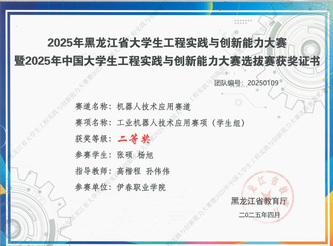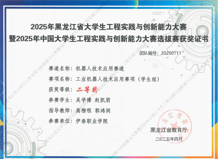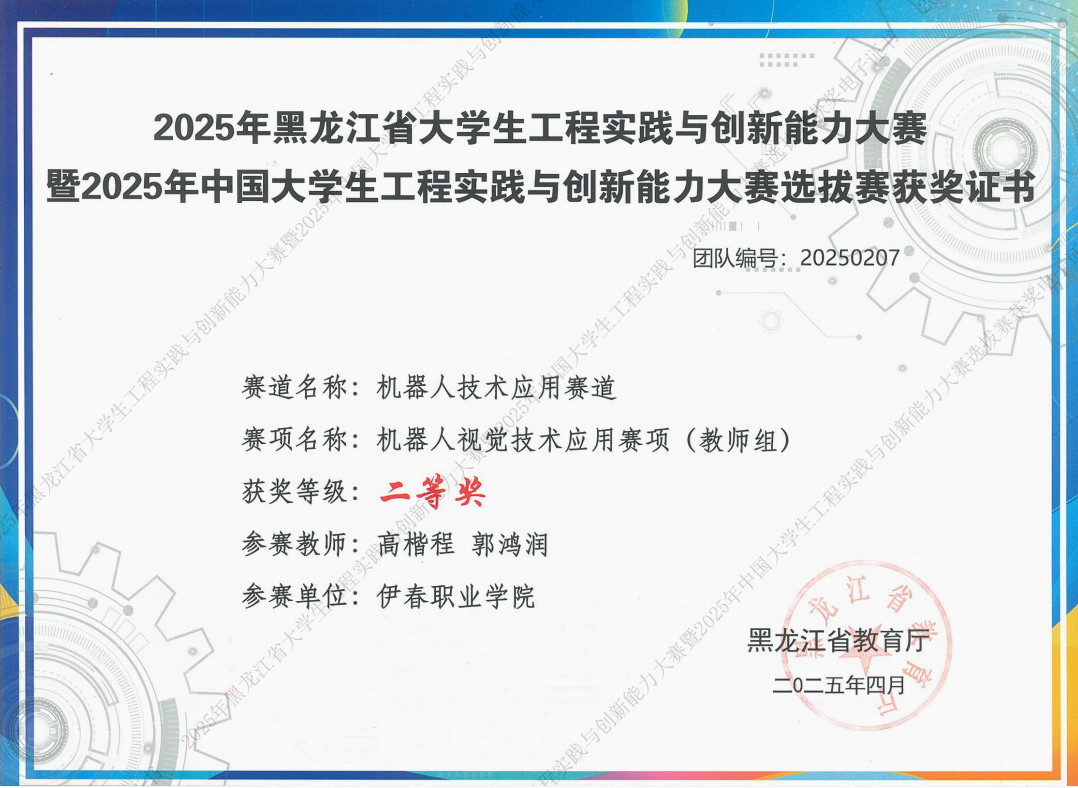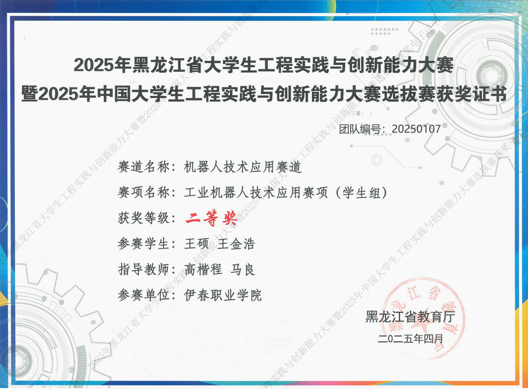 近日,2025年黑龍江省大學(xué)生工程實(shí)踐與創(chuàng)新能力大賽暨2025年中國大學(xué)生工程實(shí)踐與創(chuàng)新能力大賽選拔賽圓滿落幕。我院教師高楷程、郭鴻潤,2023級計(jì)算機(jī)應(yīng)用技術(shù)專業(yè)學(xué)生王碩、王金浩、張碩、楊旭、吳學(xué)博、趙凱朋憑借扎實(shí)的專業(yè)知識(shí)和默契的團(tuán)隊(duì)協(xié)作,在比賽中榮獲二等獎(jiǎng)的好成績。