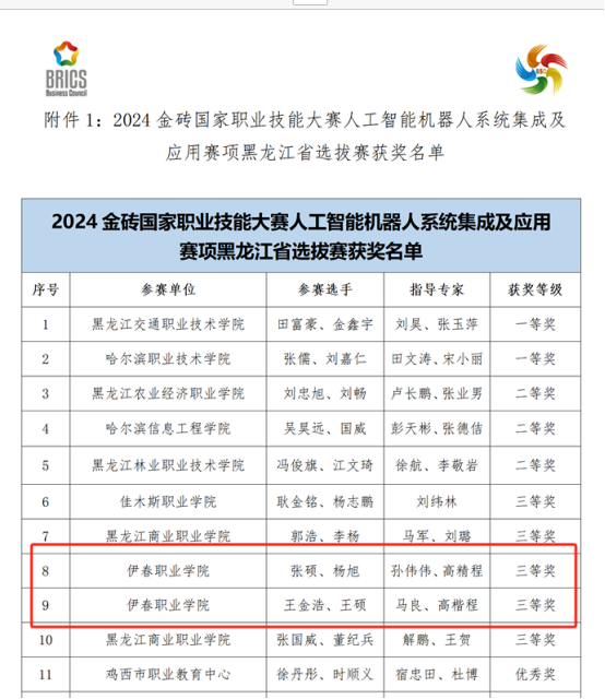 近日,2024金磚國家職業(yè)技能大賽人工智能機(jī)器人系統(tǒng)集成及應(yīng)用賽項(xiàng)黑龍江省選拔賽獲獎(jiǎng)名單公布,在我院教師孫偉偉、馬良和高楷程的指導(dǎo)下,2023級(jí)計(jì)算機(jī)應(yīng)用技術(shù)專業(yè)學(xué)生張碩、楊旭、王金浩和王碩經(jīng)過激烈的角逐,最終脫穎而出,分別榮獲三等獎(jiǎng)的好成績。