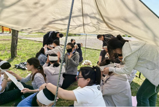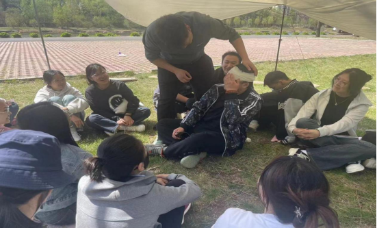 實(shí)訓(xùn)課上,王老師圍繞課程本身從戶外旅游行業(yè)發(fā)展實(shí)際情況出發(fā),組織大家利用登山杖構(gòu)建娛樂游戲“不倒森林”。