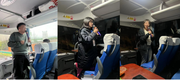 在前往景區(qū)的大巴車上,王森老師根據(jù)所學(xué)內(nèi)容進(jìn)行了車上導(dǎo)游講解訓(xùn)練:致歡迎詞、景點(diǎn)介紹、沿途導(dǎo)游講解和互動(dòng)游戲等導(dǎo)游帶團(tuán)環(huán)節(jié)的實(shí)踐。