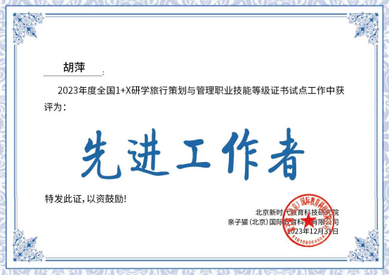 我校作為全國(guó)首批獲得“1+X”研學(xué)旅行策劃與管理(EEPM)職業(yè)技能等級(jí)證書(shū)的考點(diǎn)院校之一,被親子貓北京國(guó)際教育科技有限公司授予2023年度“1+X”研學(xué)EEPM證書(shū)試點(diǎn)院校。旅游商務(wù)學(xué)院胡萍老師被授予“2023年度全國(guó)1+X研學(xué)策劃與管理職業(yè)技能等級(jí)證書(shū)考試工作先進(jìn)工作者”。本次認(rèn)證考試全面評(píng)估了學(xué)生在研學(xué)旅行策劃與組織方面的理論知識(shí)和實(shí)際操作能力,有效提升了學(xué)生的實(shí)踐技能。