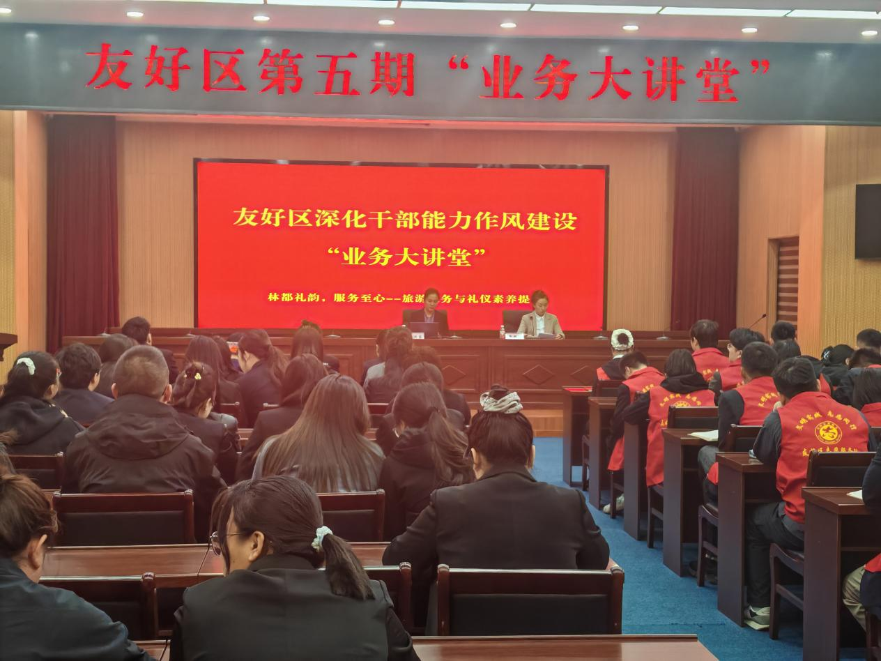 2025年5月16日,伊春市友好區(qū)第五期“干部能力作風(fēng)建設(shè)”業(yè)務(wù)大講堂成功舉辦。伊春職業(yè)學(xué)院旅游商務(wù)學(xué)院姚洪英老師受邀作《以禮塑形 以儀潤(rùn)心——打造伊春文旅服務(wù)新名片》專題講座,為全區(qū)文旅干部及從業(yè)人員提供專業(yè)化禮儀培訓(xùn)。此次活動(dòng)既是校地合作的生動(dòng)實(shí)踐,也是學(xué)院服務(wù)地方文旅產(chǎn)業(yè)發(fā)展的創(chuàng)新舉措。