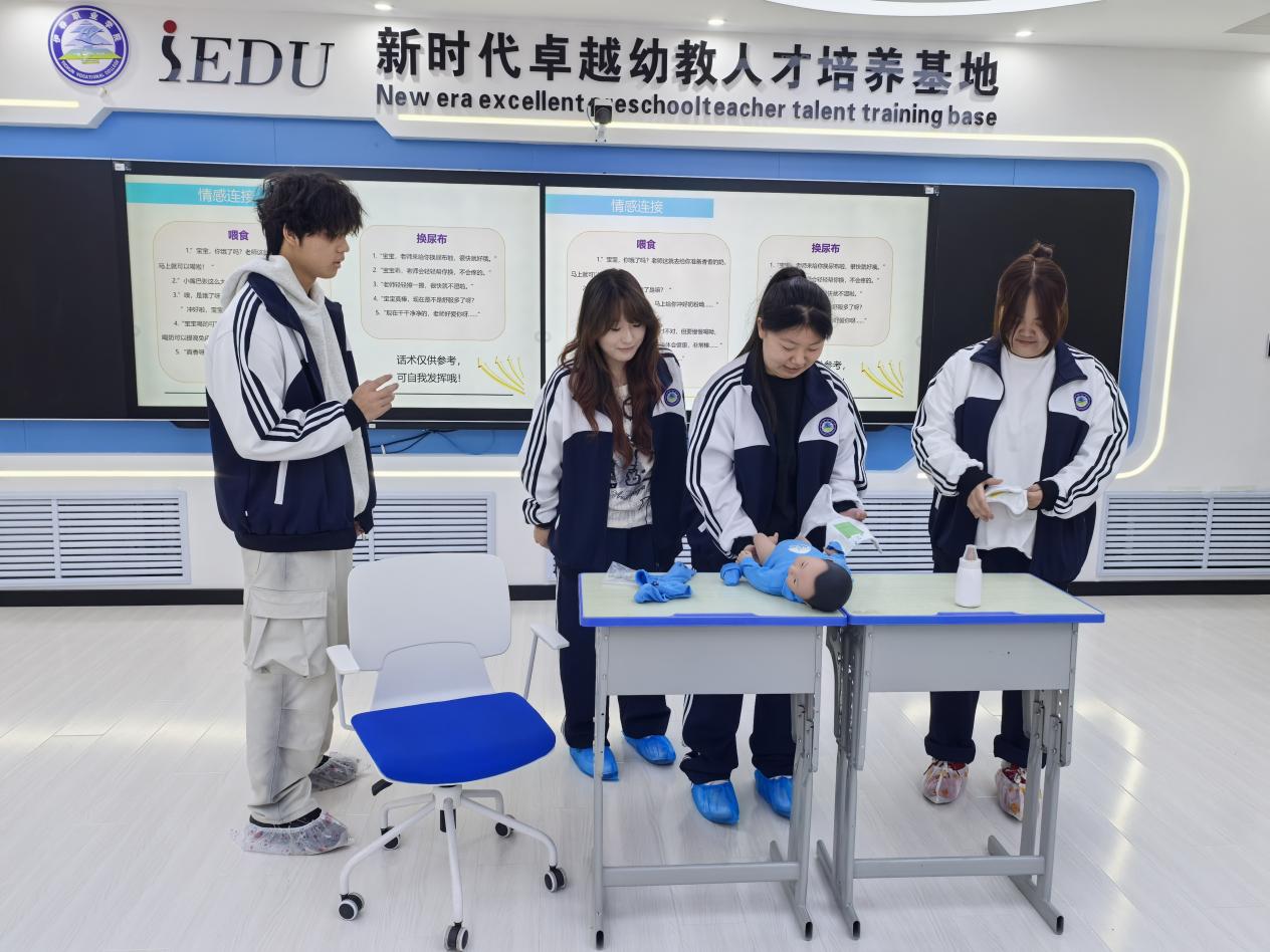 活動中,王晶以“虛實結(jié)合、理實一體”的雙導師課堂模式,為學生帶來了別開生面的“開學第一課”。課程圍繞嬰幼兒照護、早期教育等專業(yè)領(lǐng)域,結(jié)合人工智能仿真嬰兒等前沿教具,開展了情景化、互動式的實訓體驗。學生通過操作智能仿真嬰兒,深入理解嬰幼兒行為反應與護理要點,在實踐過程中強化了對專業(yè)知識的掌握,也切身感受到科技賦能教育的創(chuàng)新魅力。