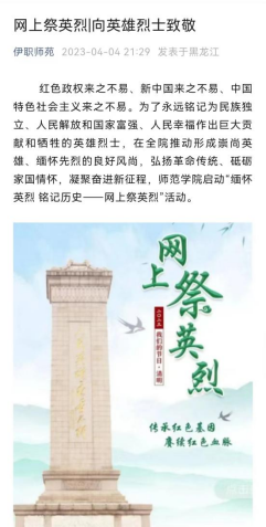 清明節(jié)當(dāng)日,師范學(xué)院部分師生代表到伊春烈士陵園祭奠英烈。由于全院師生人數(shù)眾多,受時(shí)間、空間限制,無(wú)法保證每位師生都能到烈士陵園祭奠英靈,部分師生們利用網(wǎng)絡(luò)祭奠的形式表達(dá)對(duì)英雄先烈的緬懷之情。