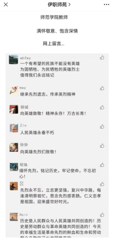 清明時(shí)節(jié),師范學(xué)院公眾號(hào)伊職師苑推出了“清明祭英烈”線上緬懷活動(dòng),積極倡導(dǎo)網(wǎng)上祭掃。全院師生在網(wǎng)上向烈士獻(xiàn)花、寄語(yǔ)留言,表達(dá)對(duì)革命先烈的深切緬懷和無(wú)限敬仰之情。