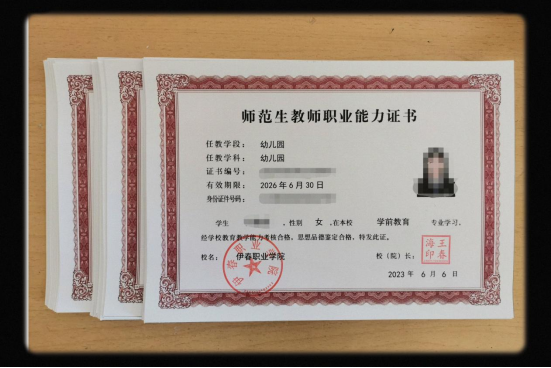 “百年大計(jì),教育為本;教育大計(jì),教師為本”。依據(jù)《關(guān)于做好2023屆教育類研究生和師范生免試認(rèn)定中小學(xué)教師資格改革工作的通知》,伊春職業(yè)學(xué)院2023年被教育部認(rèn)定為師范生(幼兒園)免試認(rèn)定高校之一(本年度學(xué)前教育專業(yè)黑龍江高職院校僅增5所免試高校)。按照省教育廳文件精神,根據(jù)師范生職業(yè)能力標(biāo)準(zhǔn),我校嚴(yán)格制定了教育教學(xué)能力考核制度,通過培養(yǎng)過程性考核和師范生職業(yè)能力測試兩方面過程性考核,以及思想品德情況及師德素養(yǎng)、教師教育課程學(xué)業(yè)成績、普通話水平測試成績、教育實(shí)習(xí)實(shí)踐完成情況、專業(yè)能力及技能培訓(xùn)完成情況、筆試、面試等環(huán)節(jié),各項(xiàng)考核合格的同學(xué)將被認(rèn)定為我院免教資師范生。2023年6月6日,師范學(xué)院學(xué)前教育專業(yè)2020級(jí)三年制、2018級(jí)五年制共有113名同學(xué)通過考核,取得了由伊春職業(yè)學(xué)院王春海院長簽發(fā)的《師范生教師職業(yè)能力合格證書》,考核通過率為89.0%。至此,本次學(xué)前教育學(xué)生教師資格免試認(rèn)定工作圓滿結(jié)束,通過考核的學(xué)生可憑借此證通過教育行政部門認(rèn)定,獲得教育部頒發(fā)的中華人民共和國教師資格證書。