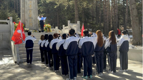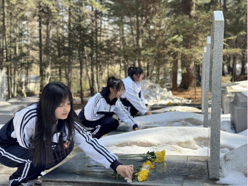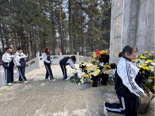 在蒼松翠柏環(huán)繞的陵園內(nèi),師生們靜默列隊,神情嚴(yán)肅而莊重。全體師生通過肅立默哀、敬獻(xiàn)花圈等方式寄托哀思,向革命先烈致以敬意。