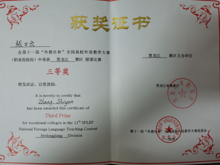 2. 張士云、王琳、趙莉莉喜獲2020年黑龍江省高等學校“教學之星”外語金課團隊大賽(高職組)三等獎,主辦單位:黑龍江省教育廳。