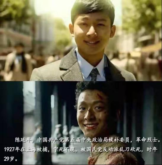 轉(zhuǎn)眼一生,轉(zhuǎn)身一世。鮮衣怒馬的少年,現(xiàn)實(shí)里,他們步伐堅(jiān)定、笑容燦爛、意氣風(fēng)發(fā)、欲遠(yuǎn)赴法國讀書,為國尋出路;看未來,他們步伐依舊、笑容如故、卻是滿身血污、鐐銬加身,慷慨赴刑場。明明上一秒還是一派暖陽秋意、離愁依依,一轉(zhuǎn)眼血痕累累、含笑赴死。這是何等的大悲大慟! 走向光明,奔赴死亡,一生一死的對(duì)立統(tǒng)一,唯一不變的是他們的腳步一直堅(jiān)定向前,從容不迫。龍華的桃花凋零在少年盛開的年華,血水里開出燦爛的花!注定會(huì)走向犧牲的路,是赤腳淌過血河的紅色壯歌!望著兩兄弟的背影,父親陳獨(dú)秀熱淚縱橫,是此刻的離別,亦是將來的永別。鏡頭最后,陳延年烈士眺望遠(yuǎn)方的笑容,心里有火,眼里清澈有光,目光所及并非漆黑一片,仿佛已然看見一個(gè)繁榮的新中國,看見中華復(fù)興時(shí)盛世的繁華!