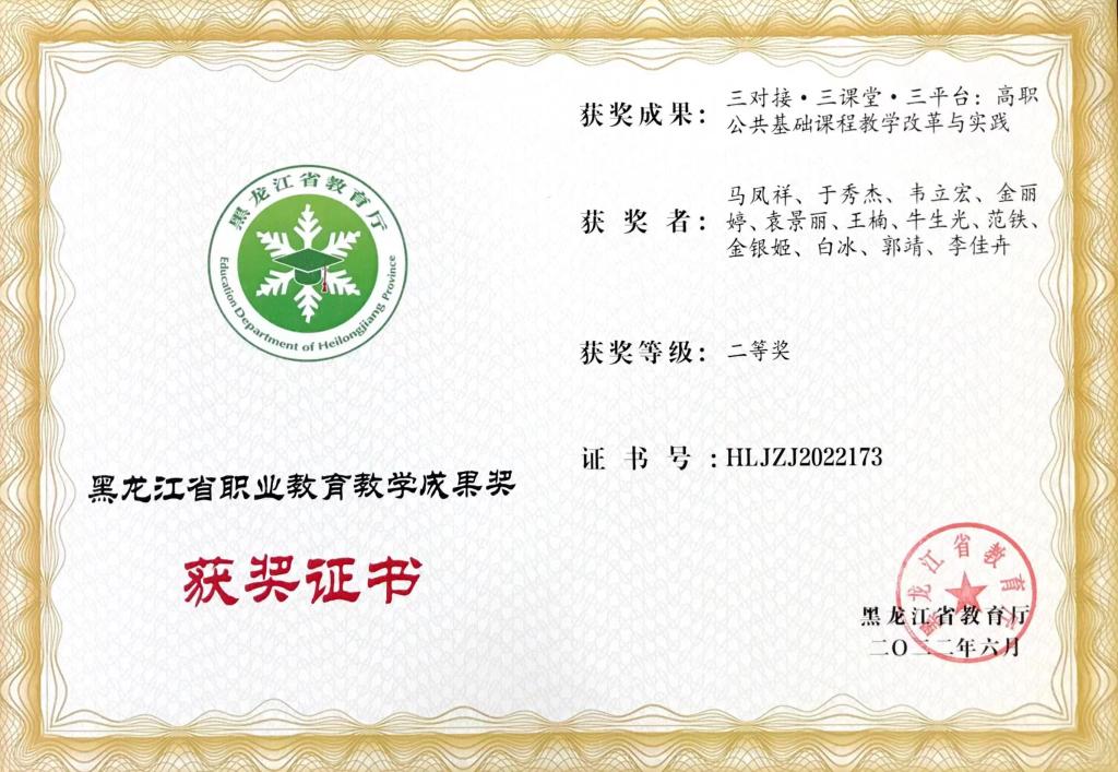 由我部門教師金麗婷、袁景麗、王楠、金銀姬、白冰參與課題“三對(duì)接· 三課堂·三平臺(tái):高職公共基礎(chǔ)課程教學(xué)改革與實(shí)踐”獲得黑龍江省教育廳“黑龍江省職業(yè)教育教學(xué)成果”二等獎(jiǎng)。