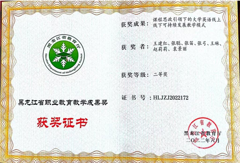 由我部門教師王建紅、張聰、張笛、王琳、袁景麗參與課題“課程思政引領(lǐng)下的大學(xué)英語(yǔ)線上線下可持續(xù)發(fā)展教學(xué)模式”獲得黑龍江省教育廳“黑龍江省職業(yè)教育教學(xué)成果”二等獎(jiǎng)。