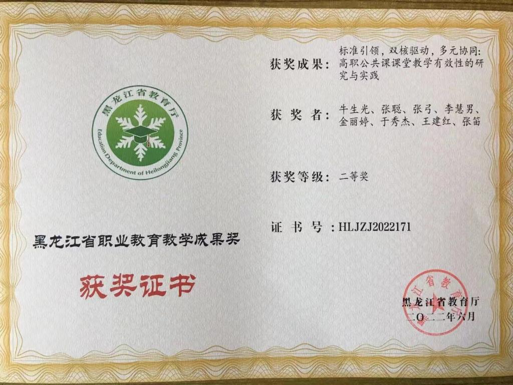 由我部門教師張聰、李慧男、金麗婷、王建紅、張笛參與課題“標(biāo)準(zhǔn)引領(lǐng),雙核驅(qū)動(dòng),多元協(xié)同:高職公共課課堂教學(xué)有效性的研究與實(shí)踐”獲得黑龍江省教育廳“黑龍江省職業(yè)教育教學(xué)成果”二等獎(jiǎng)。