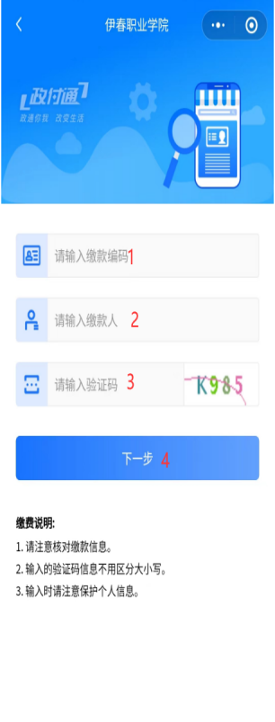 2.考生進入到【伊春職業(yè)學(xué)院】的繳款頁面后,依次填入繳款編碼(即學(xué)生身份證號碼)、學(xué)生姓名、驗證碼,點擊下一步,跳轉(zhuǎn)頁面核對繳款信息,無誤后點擊去支付→確認支付→跳轉(zhuǎn)微信支付