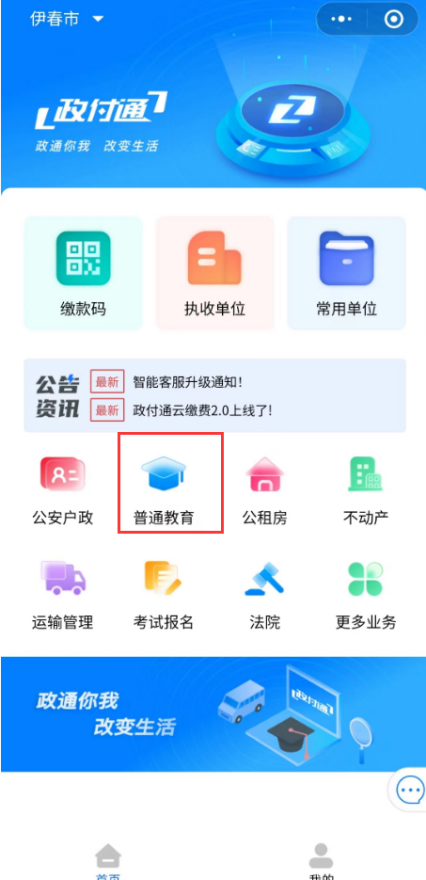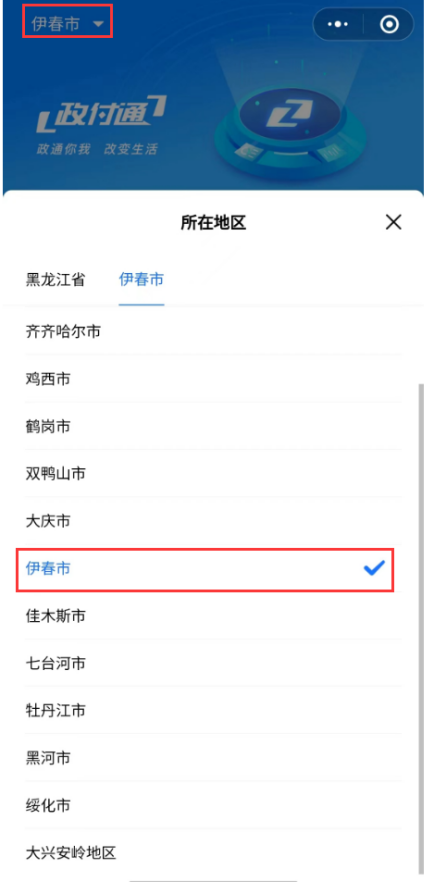 1.考生在微信小程序搜索【政付通云繳費】,點擊進入后,頁面左上角點擊選擇地市,依次選擇【伊春市】→【普通教育】→【伊春職業(yè)學(xué)院】