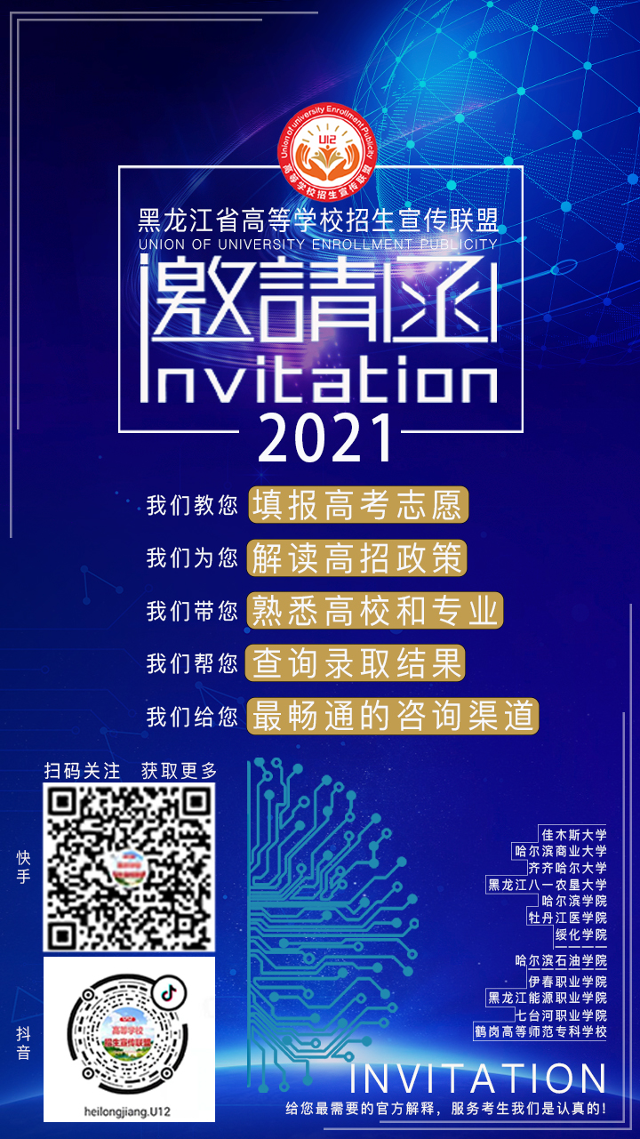 2021年是中國共產(chǎn)黨建黨100周年。結(jié)合我校黨史學(xué)習(xí)教育“學(xué)黨史、悟初心、辦實(shí)事、開新篇”的要求,由伊春職業(yè)學(xué)院、黑龍江能源職業(yè)學(xué)院、七臺(tái)河職業(yè)學(xué)院、鶴崗高等師范??茖W(xué)校、佳木斯大學(xué)、哈爾濱商業(yè)大學(xué)、齊齊哈爾大學(xué)、黑龍江八一農(nóng)墾大學(xué)、哈爾濱學(xué)院、牡丹江醫(yī)學(xué)院、綏化學(xué)院、哈爾濱石油學(xué)院等十二所學(xué)校共同組建U12黑龍江省高等學(xué)校招生宣傳聯(lián)盟。著力解決黑龍江省高考考生志愿填報(bào)、政策咨詢、專業(yè)選擇、錄取查詢等實(shí)際問題,U12聯(lián)盟高校聯(lián)合入駐快手、抖音平臺(tái),我們會(huì)以短視頻、直播等形式開展相關(guān)服務(wù),誠邀黑龍江省高考考生及家長關(guān)注,及時(shí)獲取最有效的高考訊息。
