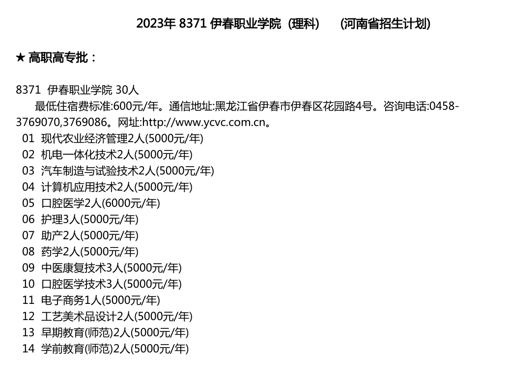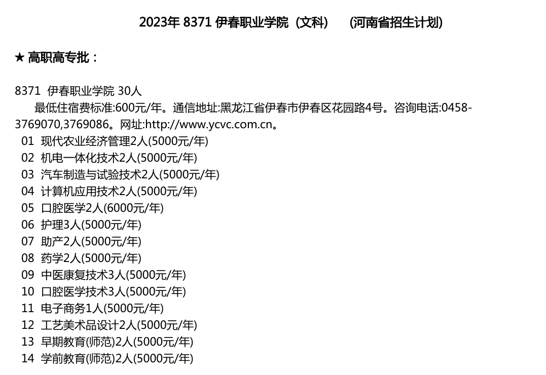 伊春職業(yè)學(xué)院2023年河南省招生計劃