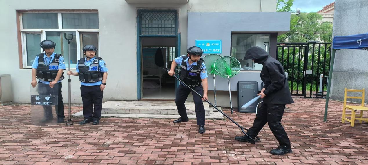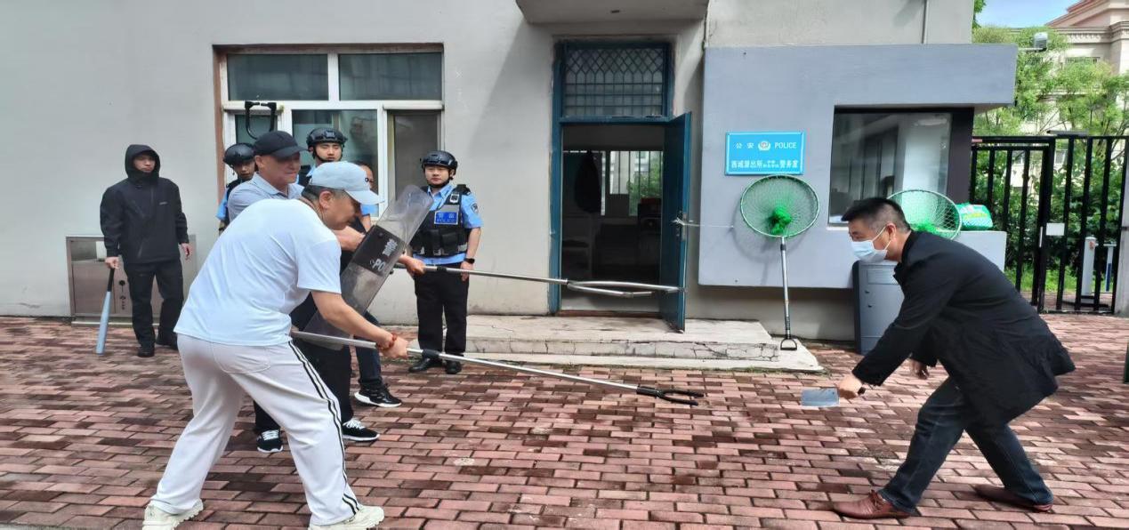 在隨后的實(shí)戰(zhàn)演練環(huán)節(jié),模擬場(chǎng)景緊張逼真。一名“歹徒”試圖強(qiáng)行闖入校園,安保人員迅速反應(yīng),第一時(shí)間按下報(bào)警按鈕,并手持防暴器械與“歹徒”周旋,阻止其進(jìn)一步行動(dòng)。西城派出所接到報(bào)警后,迅速出警,與學(xué)校安保人員緊密配合,形成有效的包圍圈,成功將“歹徒”制服,解除危機(jī)。