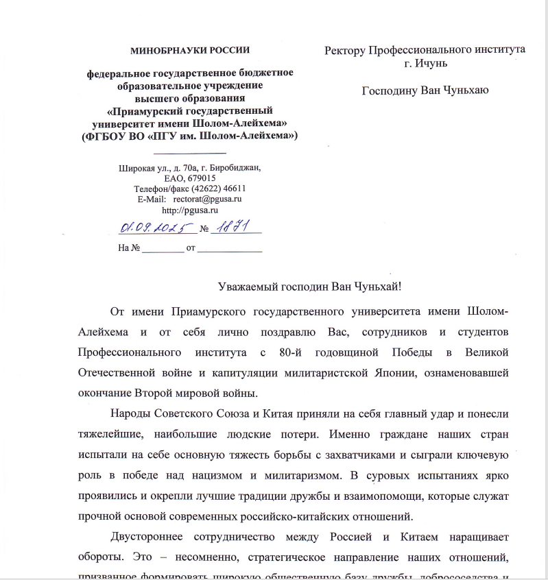 在中國人民抗日戰(zhàn)爭暨世界反法西斯戰(zhàn)爭勝利80周年的重要歷史時刻,我校收到來自俄羅斯阿列赫姆國立大學巴熱諾娃校長的賀信,向伊春職業(yè)學院全體師生員工致以崇高的敬意和熱烈的祝賀,并對兩國兩校未來的合作表達了深切期望和美好祝愿。