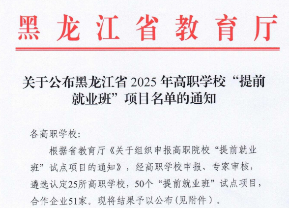 6月26日,黑龍江省教育廳公布了2025年高職學(xué)?!疤崆熬蜆I(yè)班”項(xiàng)目名單,我校旅游管理、機(jī)電一體化技術(shù)、中醫(yī)康復(fù)技術(shù)3個(gè)專業(yè)項(xiàng)目成功入選。此次獲批項(xiàng)目由旅游商務(wù)學(xué)院、工程應(yīng)用技術(shù)學(xué)院、醫(yī)學(xué)技術(shù)學(xué)院分別與黑龍江九峰山養(yǎng)心谷瀏覽景區(qū)管理有限公司、吉林市秋航科技有限公司、樂(lè)老匯養(yǎng)老集團(tuán)有限公司聯(lián)合申報(bào)。