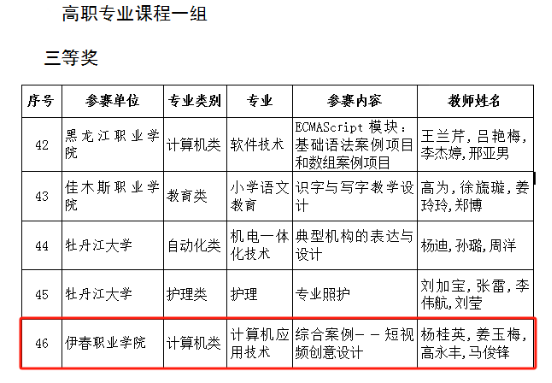 根據(jù)《關(guān)于舉辦2024年黑龍江省職業(yè)學(xué)校技能大賽教學(xué)能力比賽暨國賽選拔賽的通知》要求,學(xué)校相關(guān)部門協(xié)同配合、參賽團隊積極備戰(zhàn)、深度凝練教學(xué)特色、精心設(shè)計教學(xué)環(huán)節(jié),以教育家精神為引領(lǐng)不斷研磨參賽作品,力求精益求精。經(jīng)學(xué)校自主申報,專家網(wǎng)絡(luò)初評和現(xiàn)場決賽,我校再獲佳績!