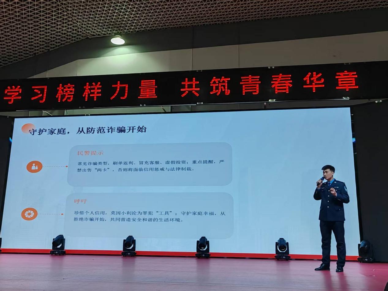 講座上,袁赫警官通過視頻播放的形式,向同學們詳細介紹了“背母求學”榜樣劉秀祥的先進事跡。劉秀祥在逆境中堅守孝道、刻苦求學,最終回饋社會的感人經(jīng)歷,深深打動了現(xiàn)場每一位同學。隨后,袁赫警官以劉秀祥的精神品質(zhì)為切入點,結(jié)合高校校園中常見的電信詐騙、校園欺凌、網(wǎng)絡謠言等實際案例,深入剖析了相關行為的法律后果與危害。他用通俗易懂的語言講解法律知識,傳授防范技巧,引導同學們樹立正確的法治觀,學會用法律武器保護自身合法權(quán)益。