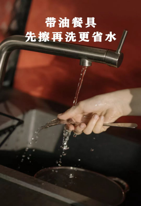 餐具清洗方面,油污先用紙或抹布擦除,再熱洗一遍,最后才用稍多的溫水或冷水洗干凈。用淘米水、煮面湯、過夜茶清洗碗筷,既可去油,又可節(jié)水、減少洗潔精污染。
