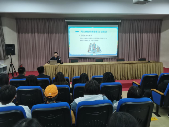 首先,政保大隊王警官從什么是邪教、邪教與宗教的區(qū)別、邪教的危害、如何識別邪教、防范邪教方面進行講解與交流。他說,同學們要從自身做起遠離邪教,樹立抵制邪教、崇尚科學的堅定信念,切實增強自身的免疫力,自覺抵制邪教,做到不聽、不信、不傳播邪教,堅決同邪教組織做斗爭。