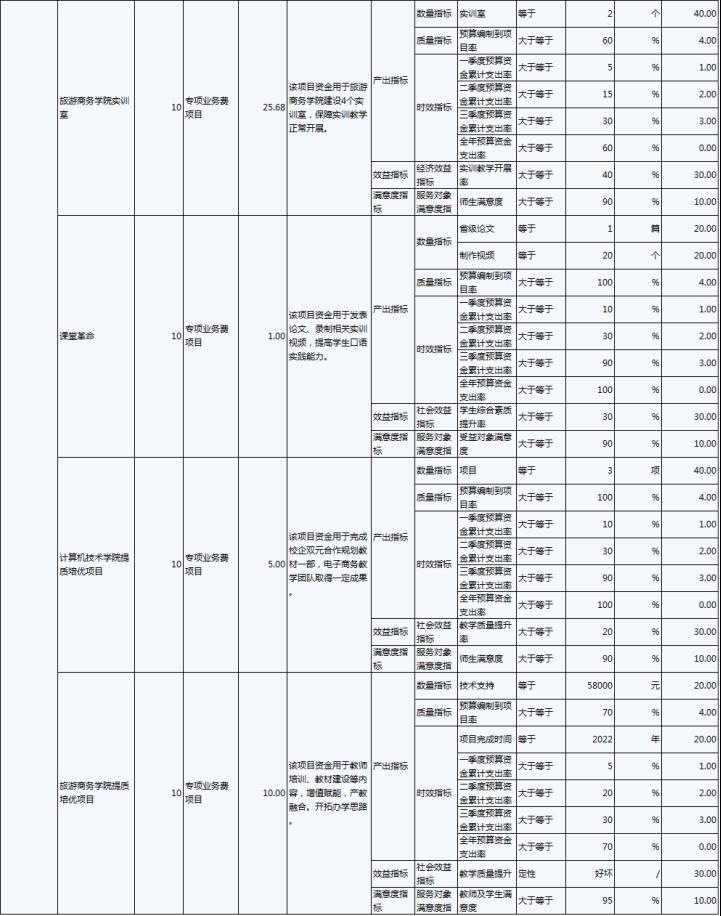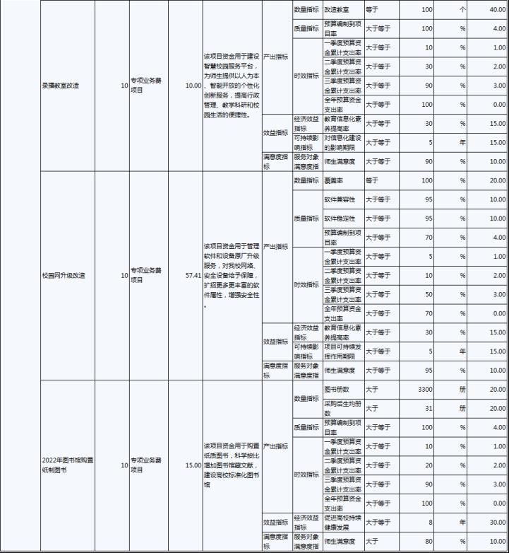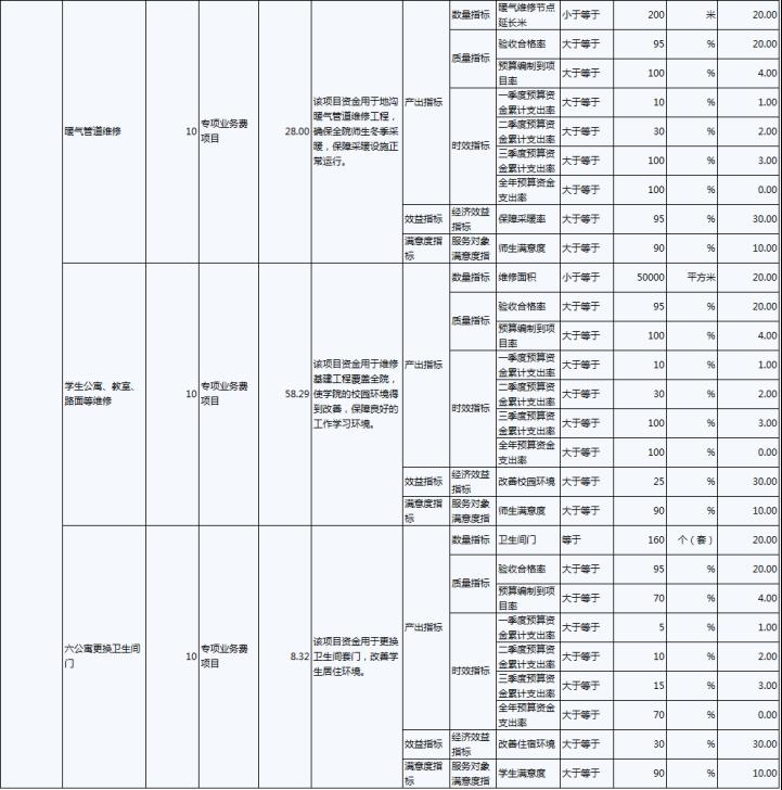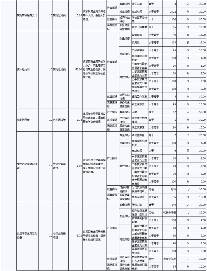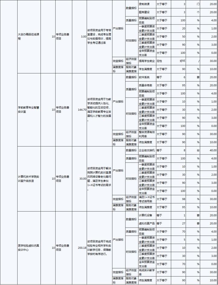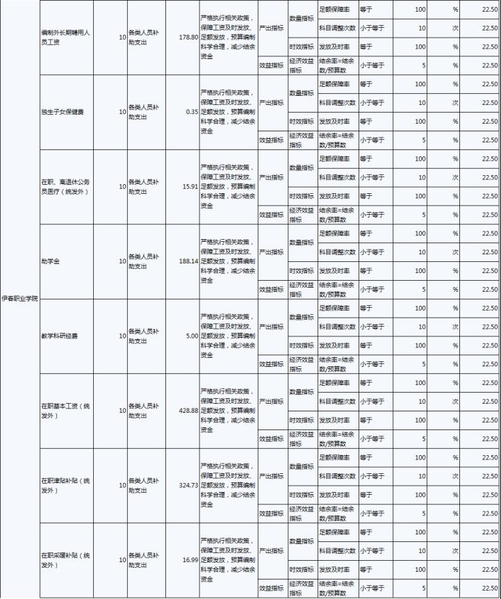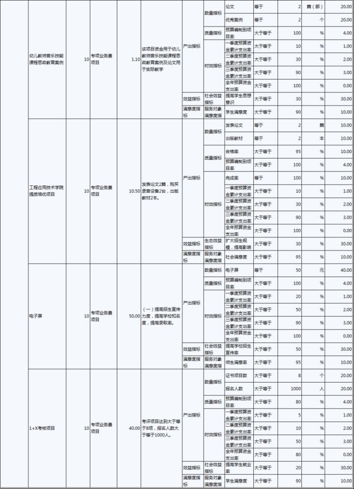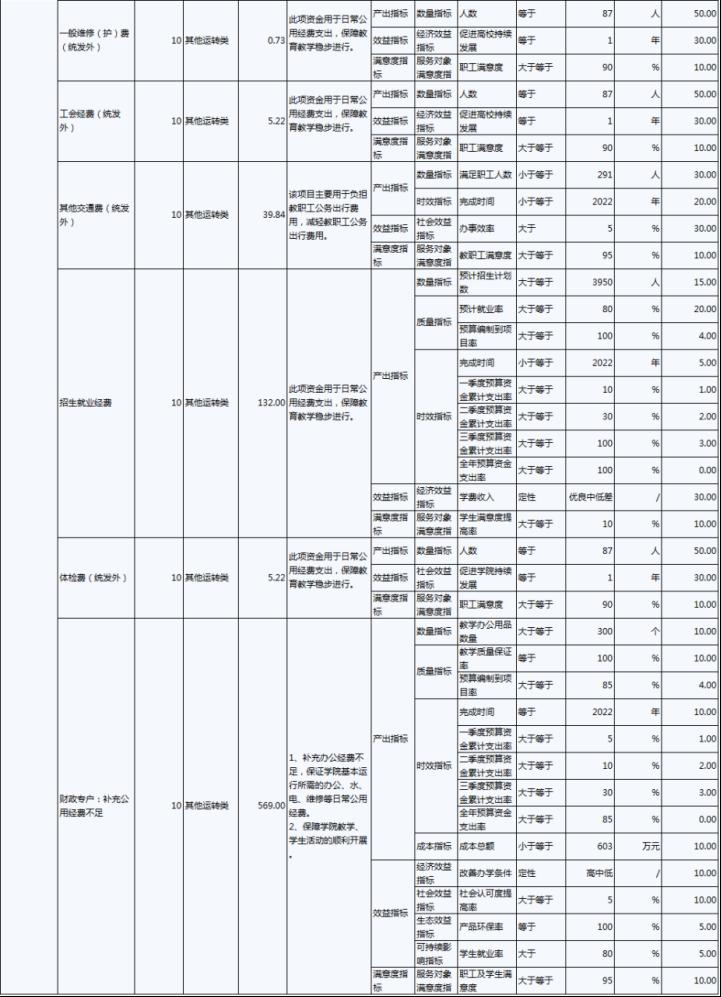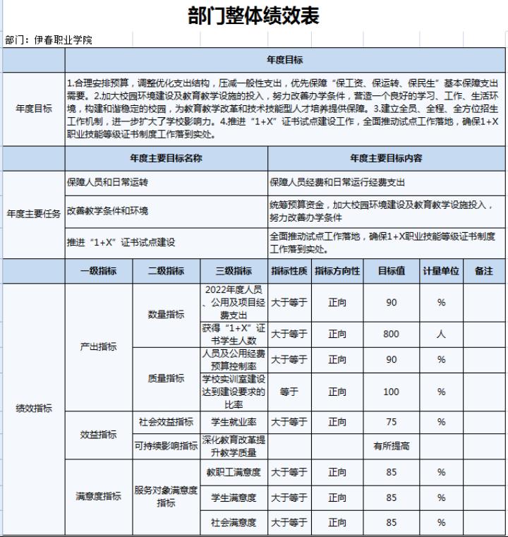 2022年,伊春職業(yè)學(xué)院年度績效目標(biāo)為:優(yōu)先保障“保工資、保運(yùn)轉(zhuǎn)、保民生”基本保障支出需要;加大校園環(huán)境建設(shè)及教育教學(xué)設(shè)施的投入,努力改善辦學(xué)條件;建立全員、全程、全方位招生工作機(jī)制;.推進(jìn)“1+X”證書試點(diǎn)建設(shè)工作,全面推動試點(diǎn)工作落地。完成實(shí)訓(xùn)室改造、“1+X”證書試點(diǎn)建設(shè)、招生就業(yè)工作等30項(xiàng)重點(diǎn)工作,主要績效指標(biāo)及指標(biāo)值情況為年度人員、公用及項(xiàng)目經(jīng)費(fèi)支出率大于等于90%;獲得“1+X”證書學(xué)生人數(shù)大于等于800人;人員及公用經(jīng)費(fèi)預(yù)算控制率大于等于90%;學(xué)校實(shí)訓(xùn)室建設(shè)達(dá)到建設(shè)要求的比率等于100%;學(xué)生就業(yè)率大于等于70%;深化教育改革提升教學(xué)質(zhì)量有所提高;教職工滿意度大于等于85%;學(xué)生滿意度大于等于85%;社會滿意度大于等于85%。