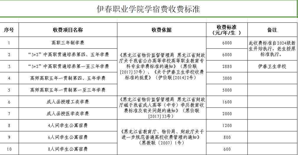 伊春職業(yè)學(xué)院學(xué)宿費(fèi)收費(fèi)標(biāo)準(zhǔn)