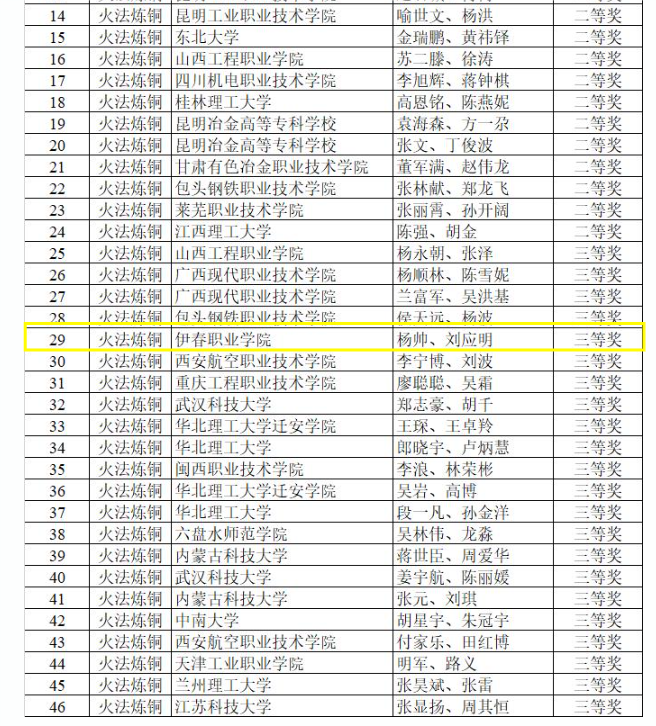 本屆競賽參賽學(xué)校共44所,其中高職???4所(煉鋼23組46人,煉銅23組46人),本科院校(含研究生)30所(煉鋼51組102人,煉銅34組68人)。煉鋼競賽項目:特等獎6組、一等獎10組、二等獎16組、三等獎30組;煉銅競賽項目:特等獎5組、一等獎7組、二等獎12組、三等獎22組。