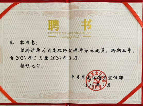 近日,經(jīng)省委宣傳部遴選我校思政部教師張黎同志被聘為省委理論宣講師資庫(kù)成員,聘期三年。