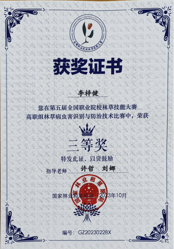 2023年10月25日-27日,由國(guó)家林業(yè)和草原局主辦的第五屆全國(guó)職業(yè)院校林草技能大賽在廣西生態(tài)工程職業(yè)技術(shù)學(xué)院舉行,來(lái)自全國(guó)86所學(xué)校,223名參賽選手參加此次比賽。我校工程應(yīng)用技術(shù)學(xué)院林業(yè)技術(shù)專業(yè)2022級(jí)學(xué)生李梓健參加林草病蟲害識(shí)別與防治技術(shù)(高職組)比賽,經(jīng)過(guò)圖片鑒定昆蟲種類、標(biāo)本鑒定病蟲害種類、綜合防治技術(shù)、鏡檢鑒定病蟲害種類、標(biāo)本制作等5個(gè)比賽環(huán)節(jié)的激烈角逐,榮獲大賽三等獎(jiǎng),在我省參賽選手中排名最高。